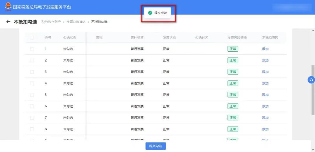 将勾選狀态設置為(wèi)“未勾選”,選擇“發票(piào)來(lái)源”和(hé)“發票(piào)狀态”等必錄項查詢條件(jiàn),點擊“查詢”。确認本次要(yà₩o)勾選的(de)發票(piào)勾選後,不(bù)抵扣原因選擇“添加”,選擇“不(bù)抵扣原因”後,提交即可(kě)。